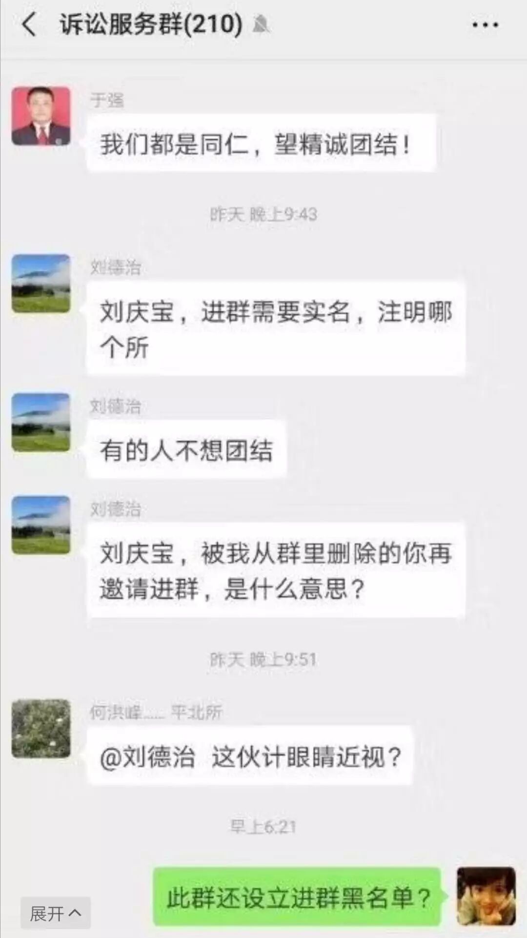 山东盛强律师事务所律师柳孔圣因为不满作为“诉讼服务群”群主、山东省平度市人民法院立案庭庭长刘德治把其踢出群的行为,一怒之下将刘德治起诉到了山东省平度市人民法院。而柳孔圣律师,以前是平度市人民法院的法官,且在审判庭审理过案件。